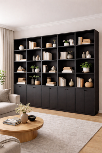 Een absolute trend van dit moment is de zwarte vakkenkast. Zwart geeft een krachtig statement en brengt direct diepte in de kamer. Een vakkenkast in zwart vormt bovendien een prachtig contrast met een lichte muur. Jouw kleurrijke boeken en accessoires springen er dan echt uit. Of je nu een industrieel of chic interieur hebt, deze kleur is altijd een succes.
