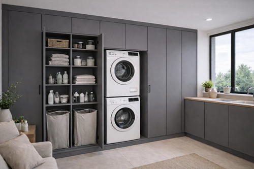 Tip: Heb je een zeer krappe wasruimte? Combineer je wasmeubel dan met een kastenwand voor een naadloze overgang van apparatuur naar voorraadkast.